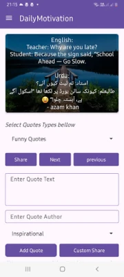 Với Trích dẫn Động lực Hàng ngày, bạn sẽ khám phá một thế giới nội dung phong phú, được phân loại tỉ mỉ để phù hợp với mọi cung bậc cảm xúc. Từ những lời khuyên về thành công và hạnh phúc, đến những suy tư về tình yêu, trí tuệ, hay thậm chí là nguồn động viên từ triết lý Hồi giáo và những câu chuyện cười vui nhộn, mọi thứ đều sẵn sàng để bạn chiêm nghiệm. Hơn thế nữa, bạn có thể dễ dàng lưu giữ những dòng chữ chạm đến trái tim mình, xây dựng bộ sưu tập cá nhân, và thậm chí tự tay chắp bút những suy nghĩ, vần thơ, hay lời động viên của riêng mình, biến ứng dụng thành một cuốn nhật ký cảm xúc độc đáo.