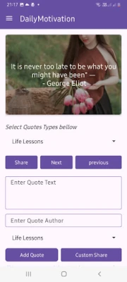Với Trích dẫn Động lực Hàng ngày, bạn sẽ khám phá một thế giới nội dung phong phú, được phân loại tỉ mỉ để phù hợp với mọi cung bậc cảm xúc. Từ những lời khuyên về thành công và hạnh phúc, đến những suy tư về tình yêu, trí tuệ, hay thậm chí là nguồn động viên từ triết lý Hồi giáo và những câu chuyện cười vui nhộn, mọi thứ đều sẵn sàng để bạn chiêm nghiệm. Hơn thế nữa, bạn có thể dễ dàng lưu giữ những dòng chữ chạm đến trái tim mình, xây dựng bộ sưu tập cá nhân, và thậm chí tự tay chắp bút những suy nghĩ, vần thơ, hay lời động viên của riêng mình, biến ứng dụng thành một cuốn nhật ký cảm xúc độc đáo.